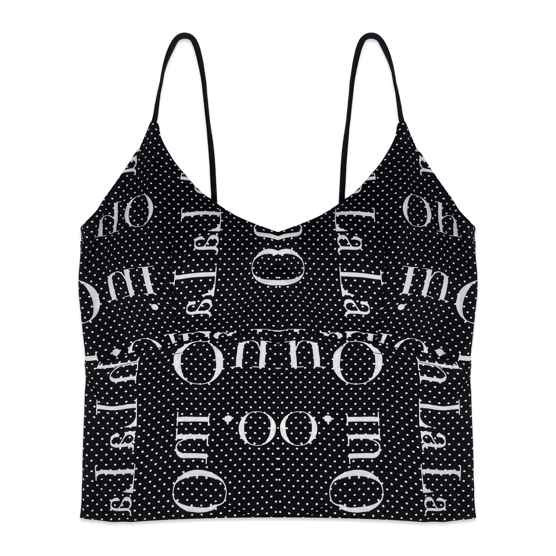 This top combines a bold black typography print with tiny white polka dots for a playful, eye‑catching look. It’s made from a soft, stretchable fabric that moves with you for all‑day comfort, and the thin spaghetti straps keep the silhouette light and minimal.