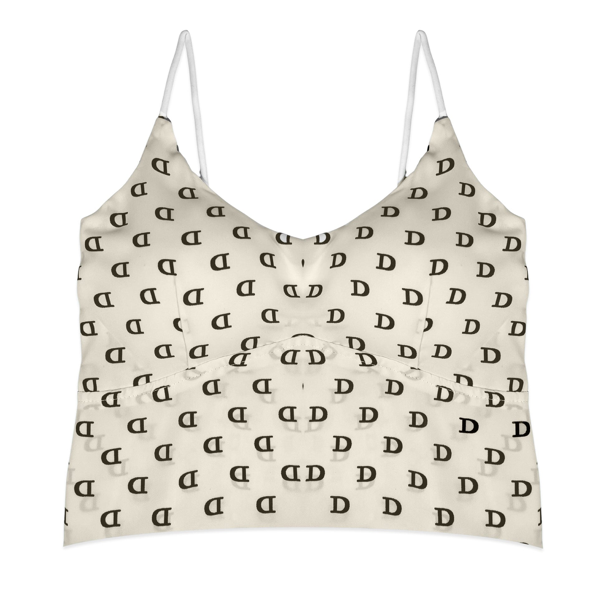 The Lunira Bralette Top features a clean cream backdrop accented with bold black “D” typography for a refined, contemporary aesthetic. Its lightweight fabric and delicate spaghetti straps offer an effortless, barely-there feel, perfect for layering or styling solo. Whether you're lounging or stepping out, Lunira blends comfort with statement appeal.